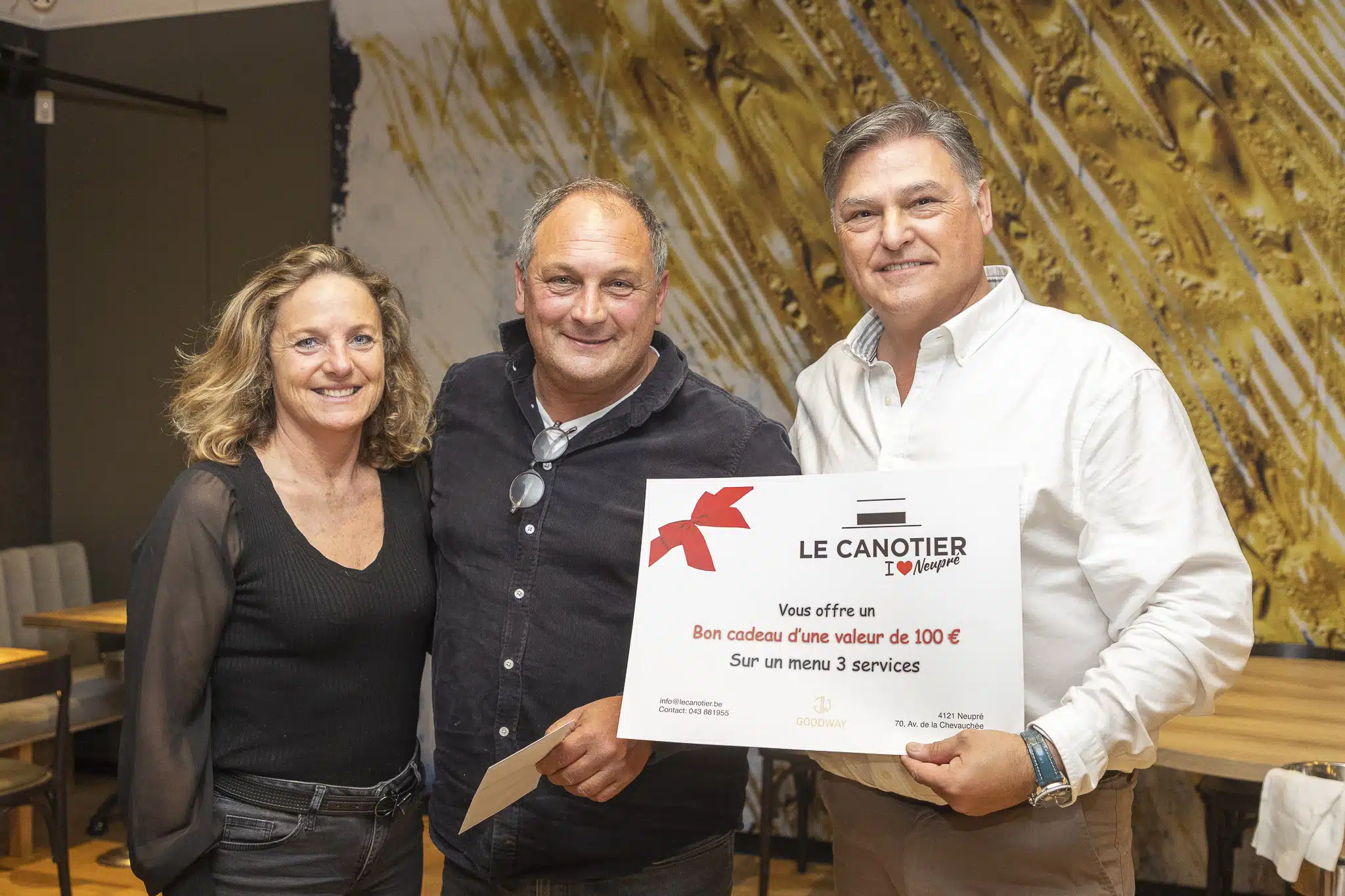 Le second reçoit un bon cadeau d’une valeur de 100 € sur un menu 3 services offert par le restaurant le Canotier au Chêne Madame à Neupré.